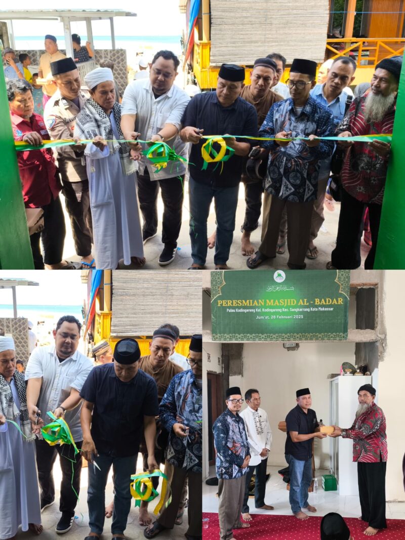 Mufasyahnews.com, Makassar – Suasana penuh kebersamaan dan khidmat konservasi Pulau Kodingareng, Kecamatan Sangkarrang, Kota Makassar, pada Jumat (28/2/2025), saat peresmian Masjid AL-BADAR berlangsung dengan penuh kekhidmatan. Peresmian ini dihadiri oleh Camat Sangkarrang, Bapak A. Asdar, SH, bersama Lurah Kodingareng, Mantan Lurah Kodingareng, Binmas Kepolisian, Ketua RT/RW, serta tokoh masyarakat dan tokoh agama setempat. Seluruh masyarakat Pulau Kodingareng turut serta dalam momen bersejarah ini.